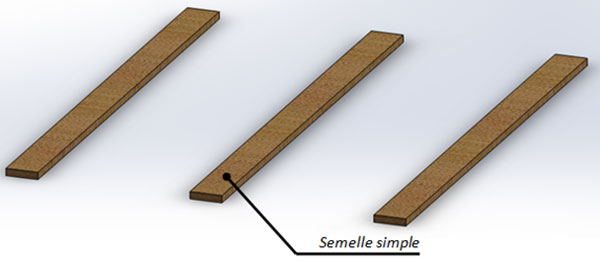 - Des semelles : Pour les palettes à 2 entrées, les semelles ne sont pas obligatoires mais elles donnent de la résistance à la palette et permettent de répartir davantage le poids des marchandises lors de l’entreposage par gerbage. Les semelles peuvent être remplacées par un plancher afin d’obtenir une palette réversible ou à double-plancher (Palette qui peut être utilisée à l’endroit et à l’envers).